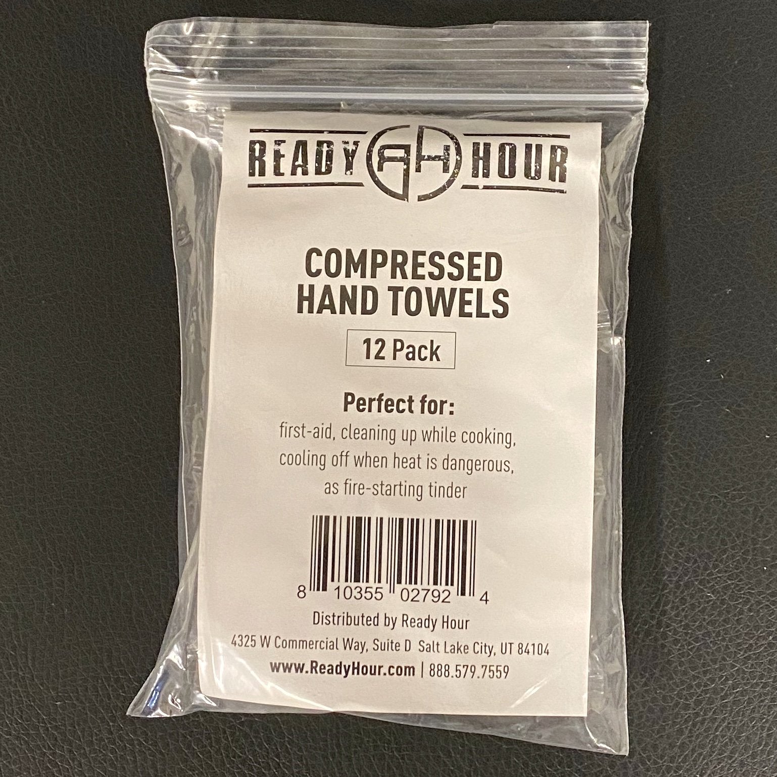 Compact disposable towels for camping, travel or emergencies. Each of these Ready Hour packages contains 12 compressed towels.