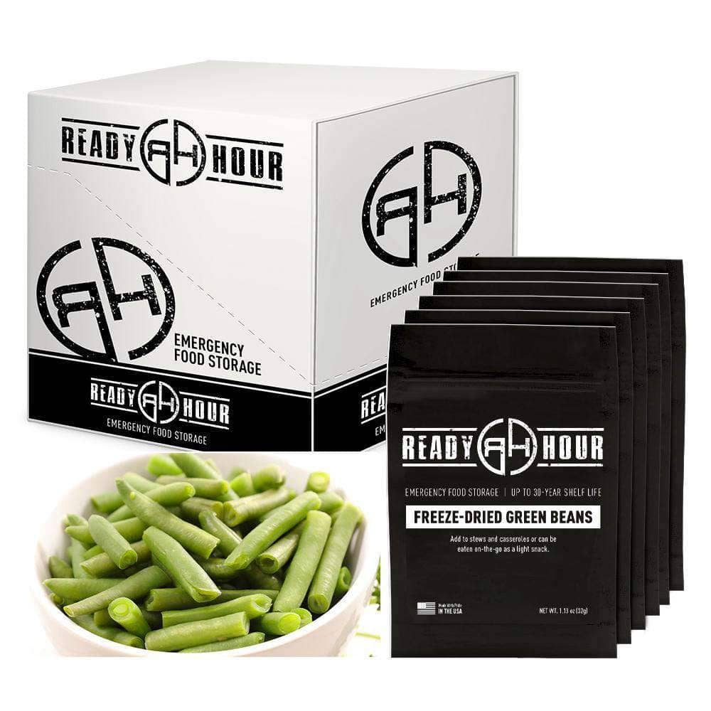 Buy a case for your everyday cooking for nutrition on demand. Don't forget to store an extra case in your emergency kit for a nutrient boost in a crisis. The Freeze-Dried Green Beans Case Pack boxes are 9 x 7 1/2 x 7 inches. NET WT. 1.13 oz (32g) per pouch, for total combined weight of 6.78 oz (192g)