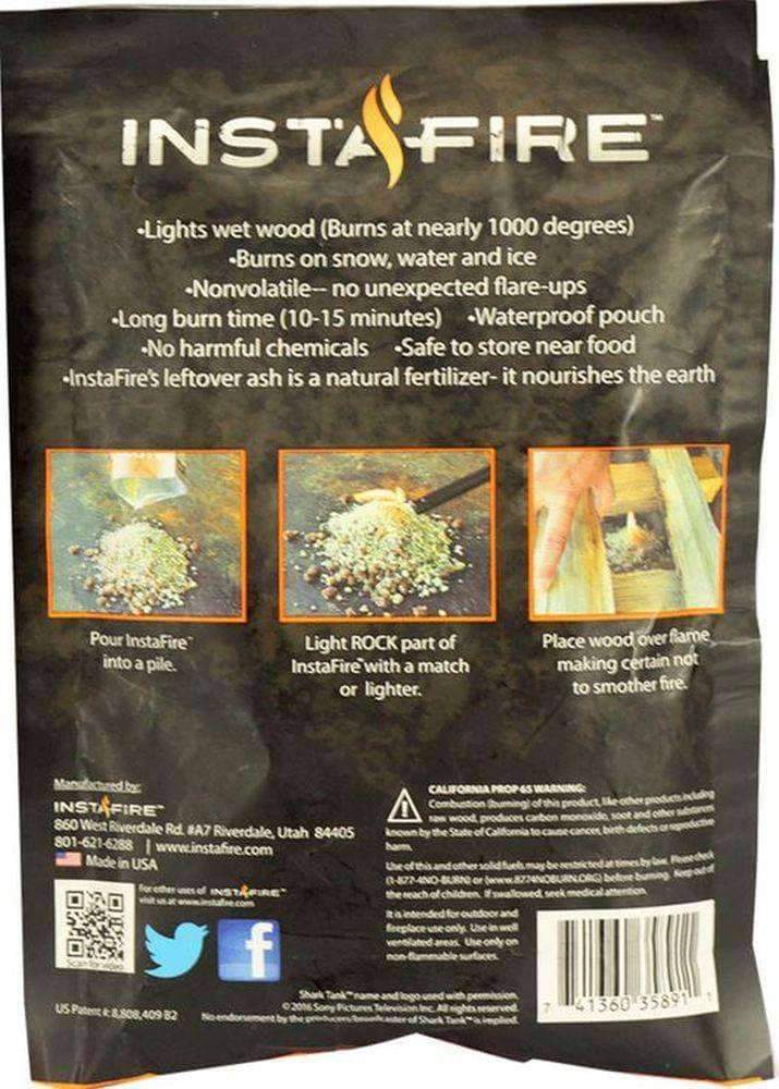Instafire is a safe, simple, and versatile fire starting product. It has water-repellant properties and and a 30-year shelf life. Use it to light campfires, prepare charcoal briquettes or as a safe and reliable fuel source for cooking or heating in emergency situations. Works well within the new Instafire Inferno Outdoor Stove.